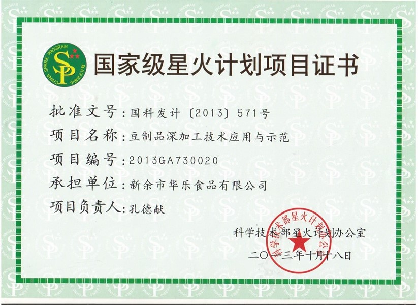 國家級星火計劃項目證書